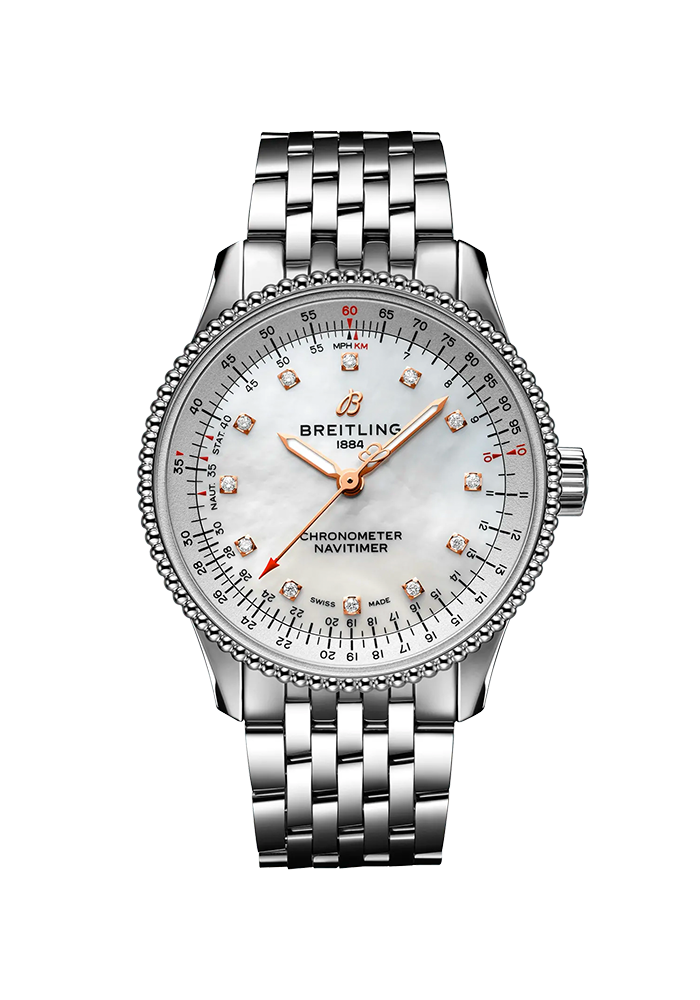 | Beschreibung | Die Navitimer Automatic 35 kombiniert raffiniert und elegant das historische Flair einer wahren Legende mit der Finesse eines modernen Zeitmessers. Das 35-mm-Gehäuse ist in vielen verschiedenen Materialien erhältlich, auch in Edelstahl und 18-karätigem Rotgold, und verfügt über eine Perlenlünette. Bei den Zifferblättern ist eine Reihe eleganter silberner, blauer oder kupferner Versionen erhältlich sowie eine diamantbesetzte Version aus weissem Perlmutt. Die Navitimer Automatic 35 ist mit einem passenden Armband oder einem glänzenden blauen, braunen oder burgunderroten Alligatorlederarmband sowohl mit Dornschliesse als auch Faltschliesse aus Edelstahl erhältlich. Angetrieben wird sie vom Breitling-Kaliber 17, einem COSC-zertifizierten Chronometer. |