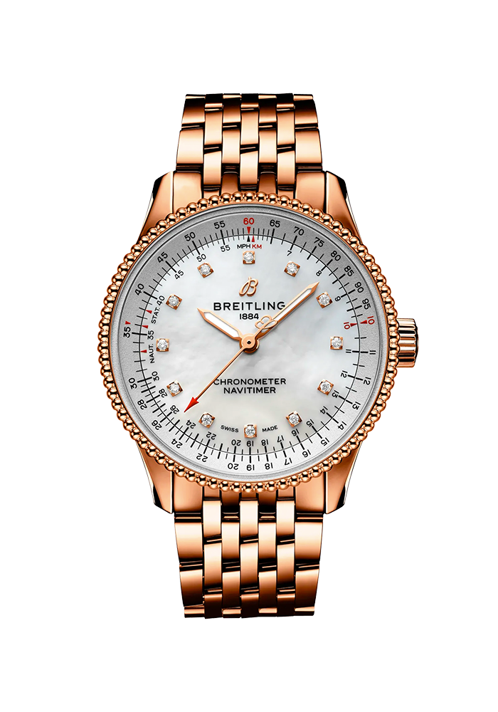 | Beschreibung | Die Navitimer Automatic 35 kombiniert raffiniert und elegant das historische Flair einer wahren Legende mit der Finesse eines modernen Zeitmessers. Das 35-mm-Gehäuse ist in vielen verschiedenen Materialien erhältlich, auch in Edelstahl und 18-karätigem Rotgold, und verfügt über eine Perlenlünette. Bei den Zifferblättern ist eine Reihe eleganter silberner, blauer oder kupferner Versionen erhältlich sowie eine diamantbesetzte Version aus weissem Perlmutt. Die Navitimer Automatic 35 ist mit einem passenden Armband oder einem glänzenden blauen, braunen oder burgunderroten Alligatorlederarmband sowohl mit Dornschliesse als auch Faltschliesse aus Edelstahl erhältlich. Angetrieben wird sie vom Breitling-Kaliber 17, einem COSC-zertifizierten Chronometer. |