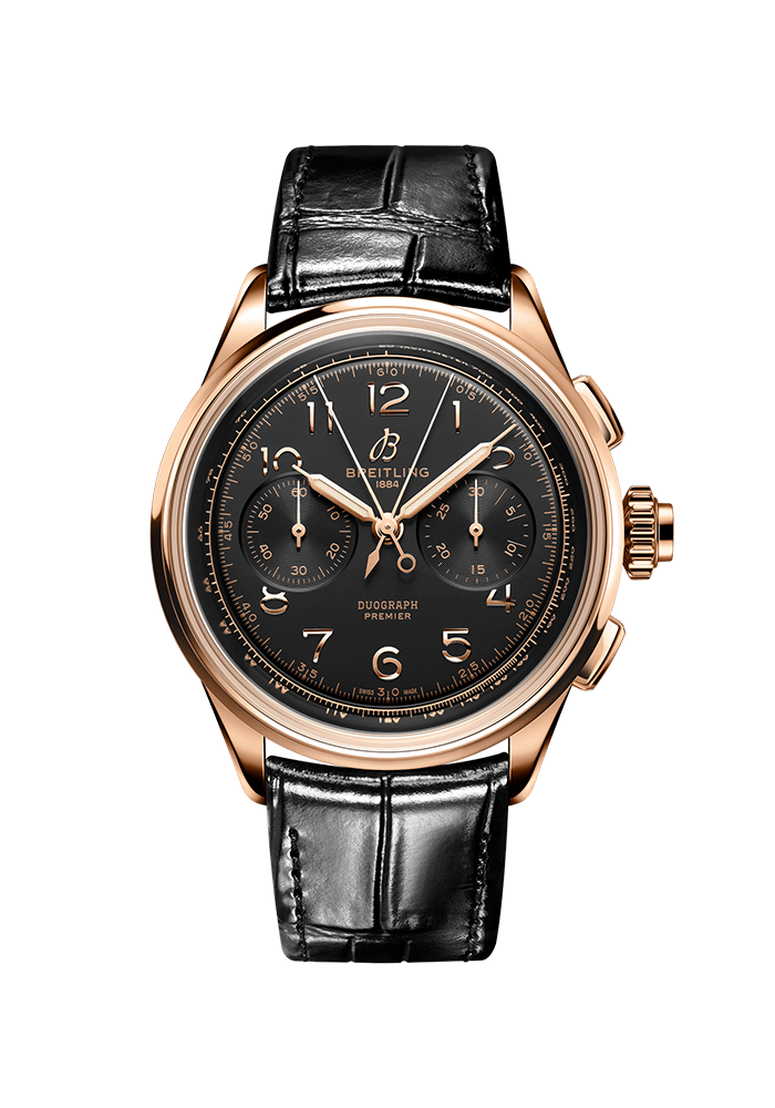 | Beschreibung | Die Premier Duograph, eine Hommage an drei Generationen von Erfindern um Léon, Gaston und Willy Breitling, präsentiert Breitlings Uhrmacherkunst mit ihrer ausgeklügelten Schleppzeiger-Komplikation. Nach Willy Breitlings Auffassung gibt die Premier «unweigerlich Zeugnis von tadellosem Geschmack». |