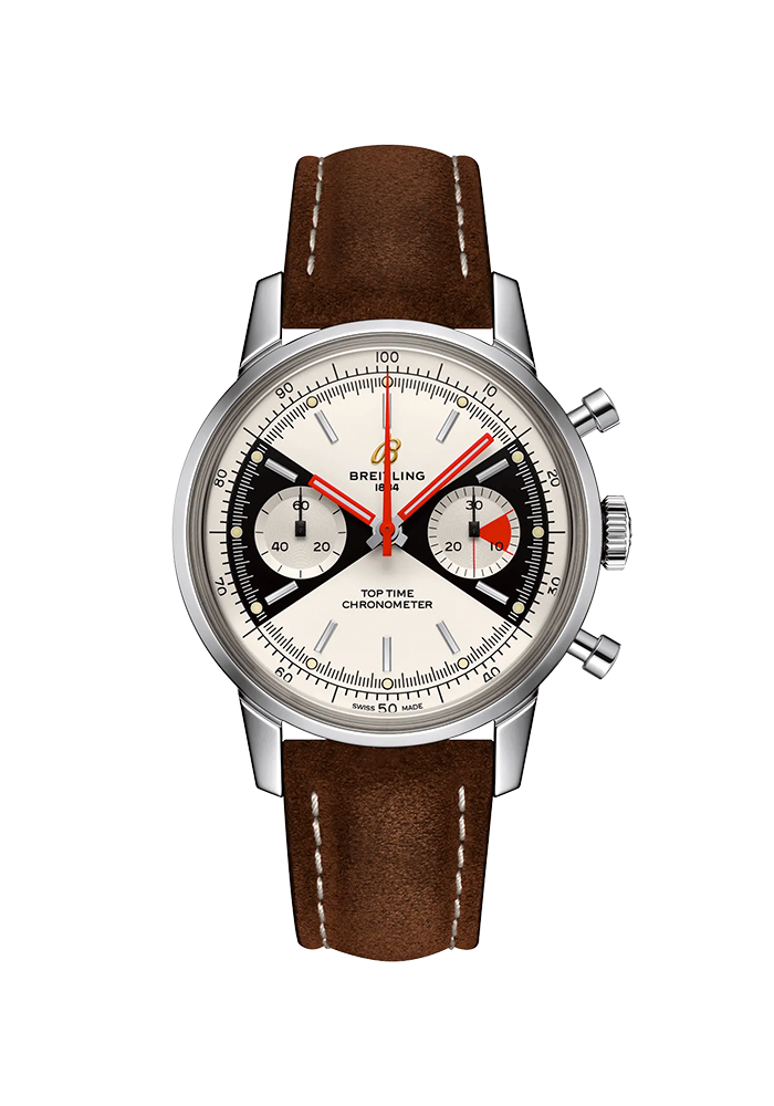 | Beschreibung | Die Breitling Top Time spricht mit ihrem einzigartigen Stil Männer und Frauen an, die diese Mischung aus Design, Geschichte und grossartiger Chronographenleistung schätzen. Die ursprüngliche Top Time kam in den 1960er-Jahren mit einer klaren Mission auf den Markt: den Bedürfnissen der «jungen und aktiven Berufstätigen» mit einer Palette ultramoderner Chronographen gerecht zu werden. Die Sportuhr schlug bei der Zielgruppe ein, gefiel aber auch jungen Frauen, die sich von den markanten Linien und der unbestreitbaren Eleganz angezogen fühlten. Die heutige Breitling Top Time stellt eine moderne Interpretation dieses stilvollen Chronographen dar, mit einem der unverkennbarsten Zifferblätter, die jemals geschaffen wurden. Unter Sammlern ist dieses Zifferblatt auch als «Zorro-Zifferblatt» bekannt. Die Top Time verfügt über ein 41-mm-Edelstahlgehäuse sowie ein braunes Nubukarmband mit Dornschliesse aus Edelstahl. Das Modell ist auf 2000 Stück limitiert und wird vom Breitling-Kaliber B23, einem COSC-zertifizierten Chronographenwerk, angetrieben. |